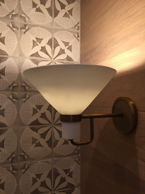 As I said earlier, this one of the best Showcase houses in recent years. Absolutely every space is a success, and designer Lauren Berry exemplifies this brilliantly. Given a very small, closet-like space on the second floor tucked away amongst all the bedrooms, she created an "En Suite Espresso and Cocktail Bar" that is sweet and lovely. Cabinetry in blackened charcoal and walnut finishes, European white oak floor and wall tiles made in the Netherlands, beautiful hand-painted terra cotta tiles, a sink inlaid with Mother-of-Pearl (!), luxe gold bronze fixtures,and exquisite lighting from Johnathan Browning make this otherwise forgettable space quite memorable!